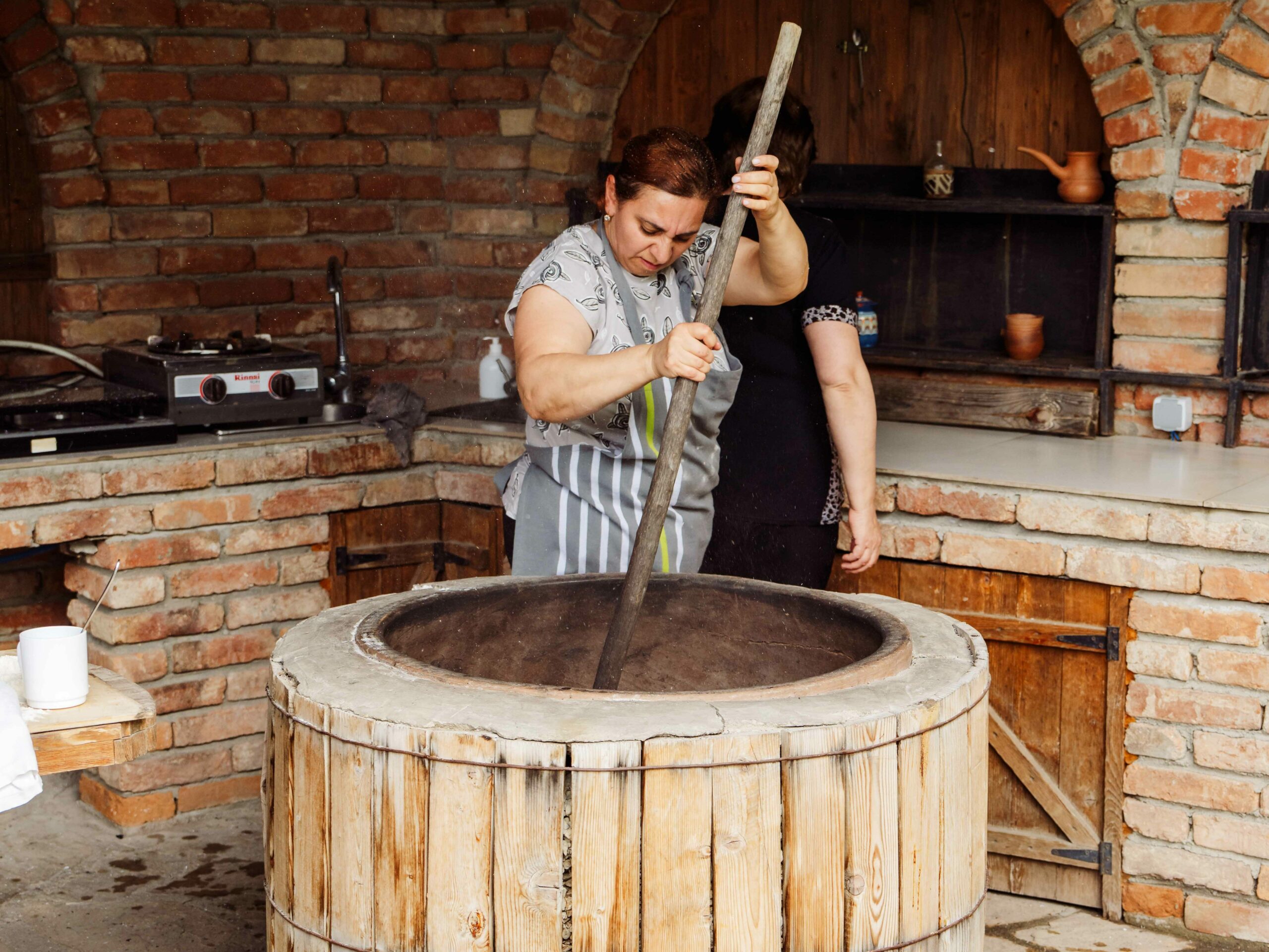 We will not only visit the organic winery and the vineyards, and taste her natural wines, but also participate in a cooking demo of a Megrelian, Georgia’s most acclaimed cuisine, called elargi which we will held stretch in the cooking hut.