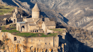 At Tatev Monastery, the serene atmosphere contrasts with the dramatic rocky plateau to create a sense of timelessness, allowing you to imagine the life of monks who once studied, prayed, and taught within its walls.