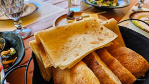 The wheat and water dough is divided into balls, which are then rolled out into thin layers on an oval cushion. The show begins when they start slapping it against the walls of a traditional conical clay oven.