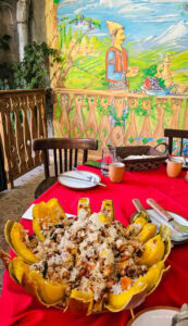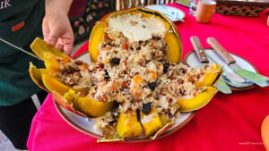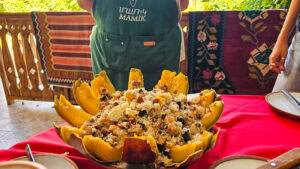 We will also participate in making our dessert: ghapama, a traditional Armenian dish that consists of stuffing a pumpkin with dried fruits and nuts, rice, butter and honey, and cooking it in the oven. Ghapama is the symbol of abundance and prosperity.