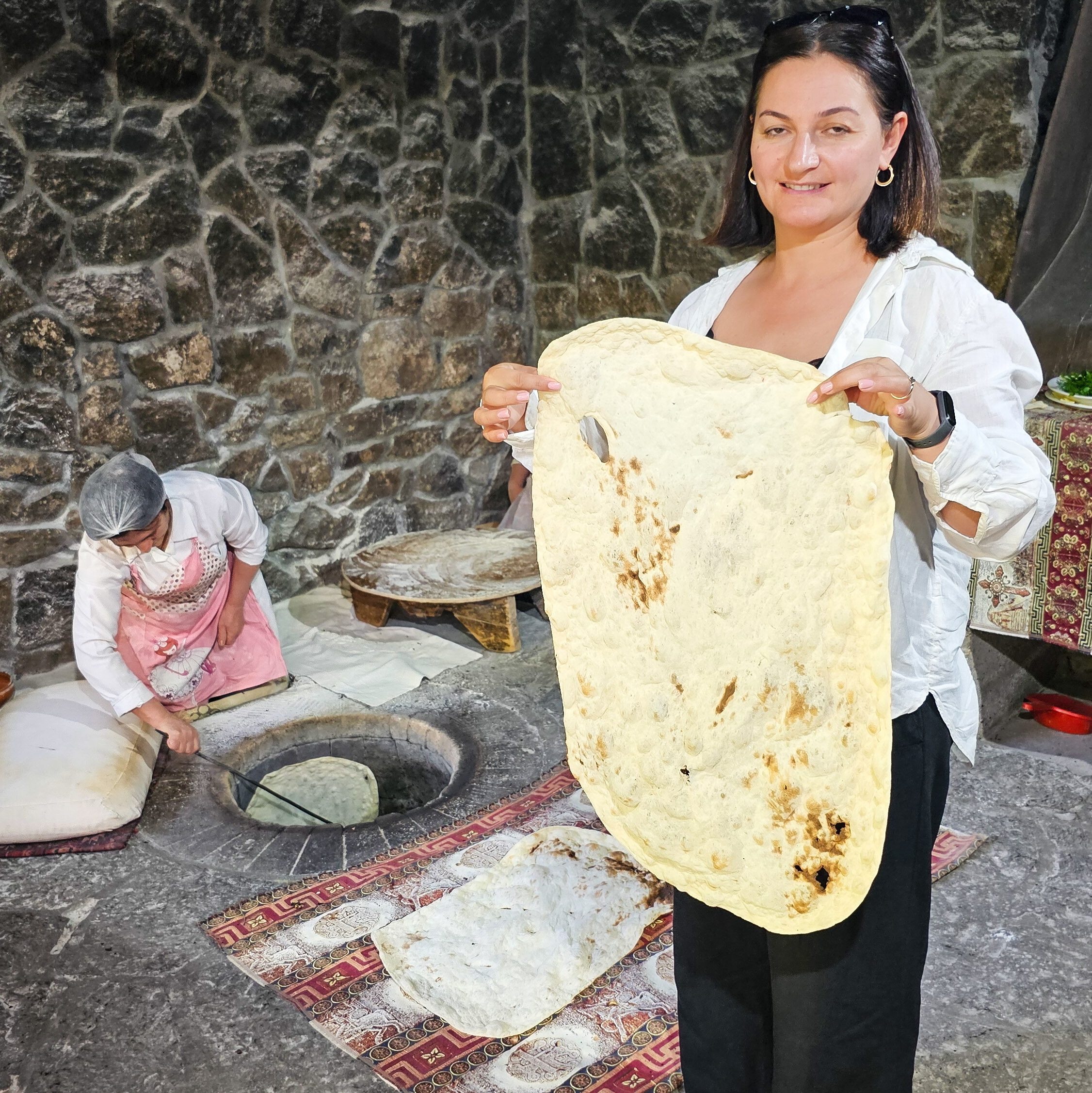 Inclusions: Breakfast at the hotel, lavash masterclass and lunch at local restaurant, transportation in a minibus, guided visits of Geghard Monastery with private concert and Garni Temple, descend and walk of Azat river Canyon, Masoor House visit, Gata masterclass.