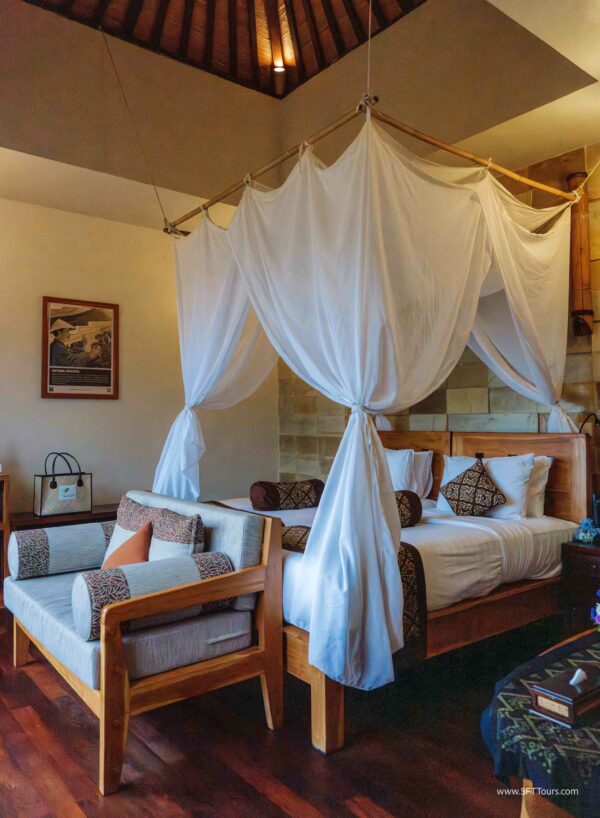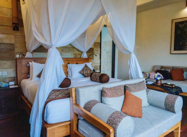 We will stay in the very spacious suites, all of which come with balconies facing the paddies and a separate lounge, bathroom and bedroom space.