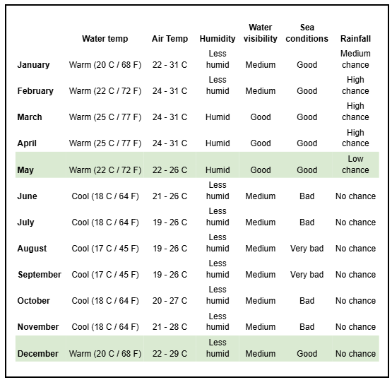However, during these months, the chance of rainfall and humidity are low, so these may be good months to visit if you plan to spend more time on land, and if you’re someone who doen’t tolerate heat very well.