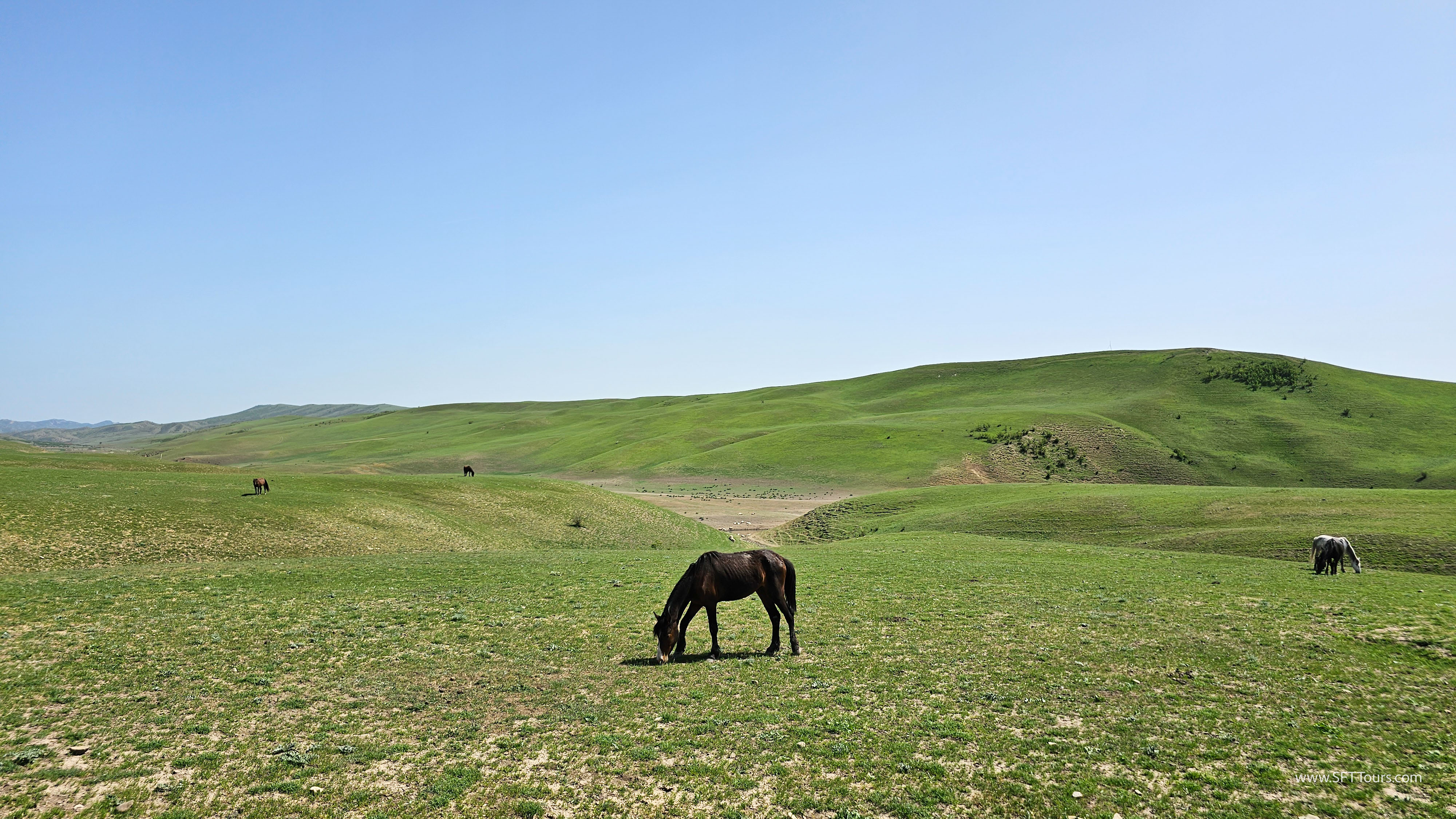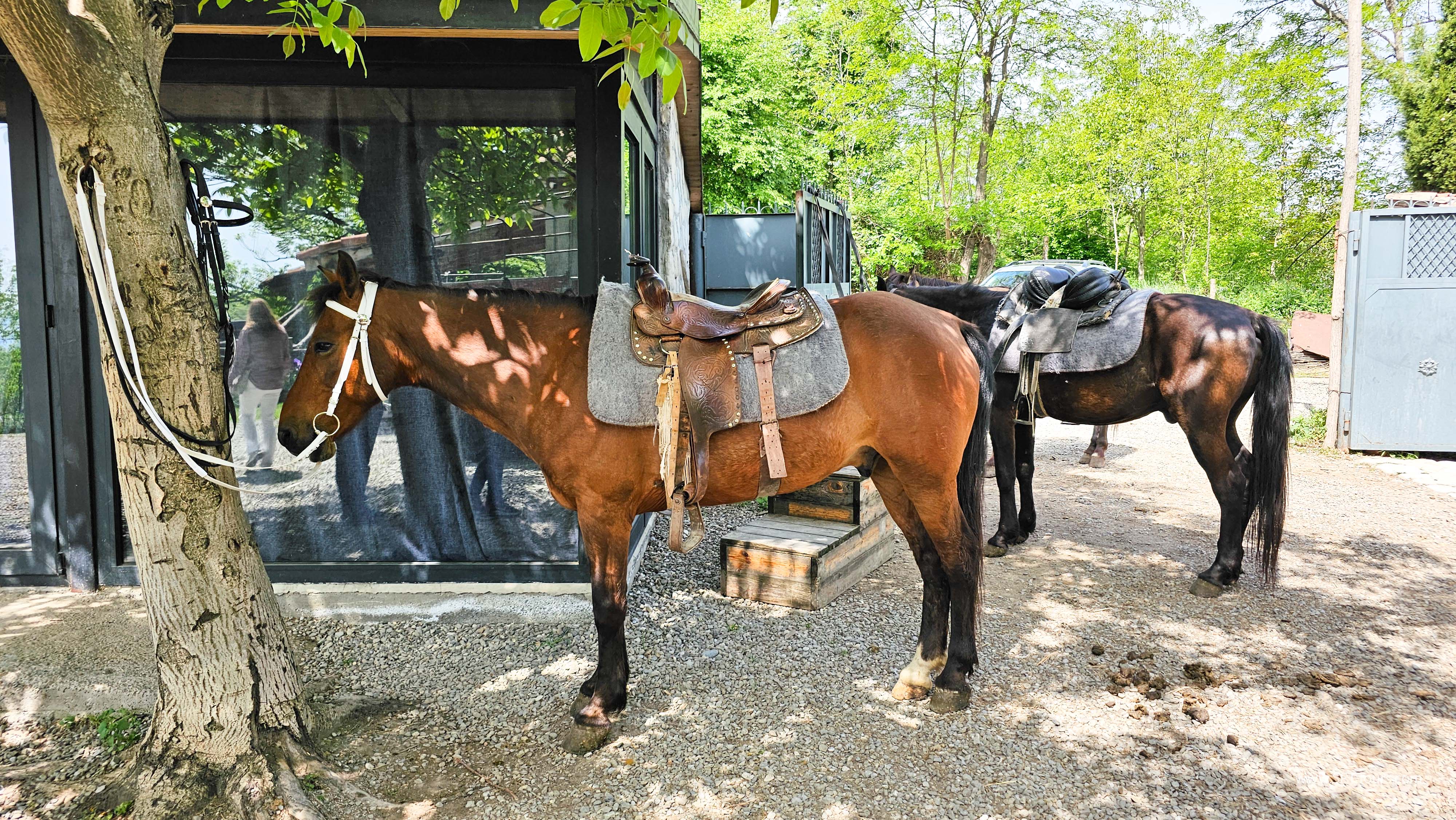 The ranch has a dozen Caucasian horses ready to take us on an easy ride through the quiet mountains.