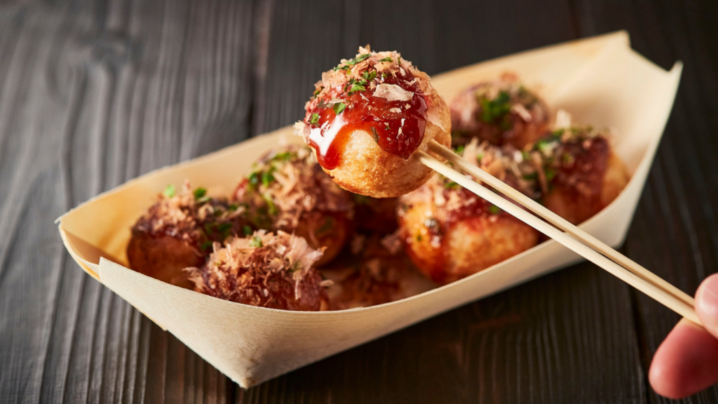 Takoyaki: Bite-sized batter balls filled with octopus, topped with sauce and bonito flakes. Hot, messy, and addictive.