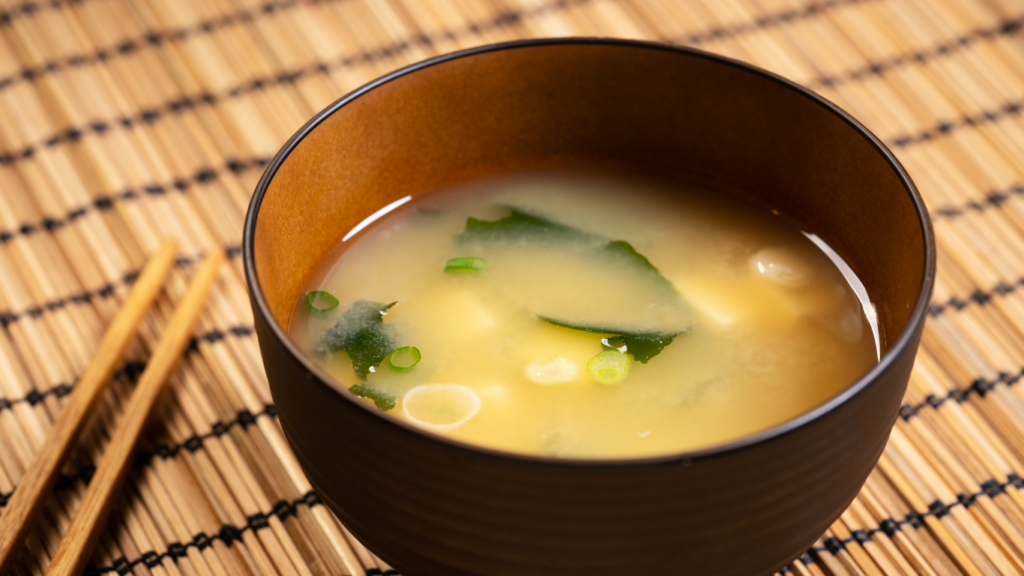 Miso soup: Made of miso in a dashi stock (dried baby sardines, dried kelp, thin shavings of fermented, dried, and smoked bonito or dried shiitake) with cubes of tofu and spring onion and usually served as part of a meal along with rice and side dishes.