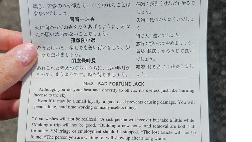 - The Japanese are very superstitious. Temples will have “Luck draws” where you can pull a message and read your luck. But beware, many will return bad luck! Amulets are for sale at most temples and you can also buy blessings by the monks. Number 4 is avoided on lifts, trains and floors because it sounds like “death” (shi).