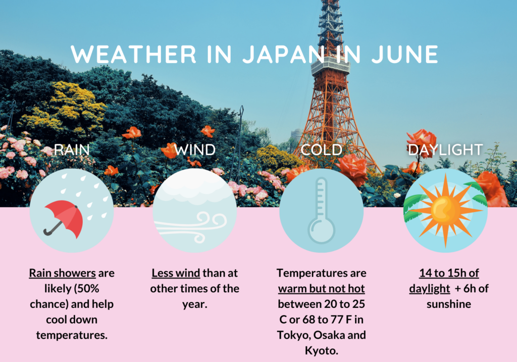 June is the end of spring and beginning of summer in Japan and it is a quieter time of the year to visit, with the lowest tourist traffic besides winter, and milder temperatures than the rest of the summer, but the risk of rain.