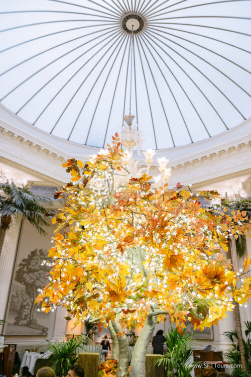 Palm Court features a striking glass dome, Venetian chandelier, and live harp music.