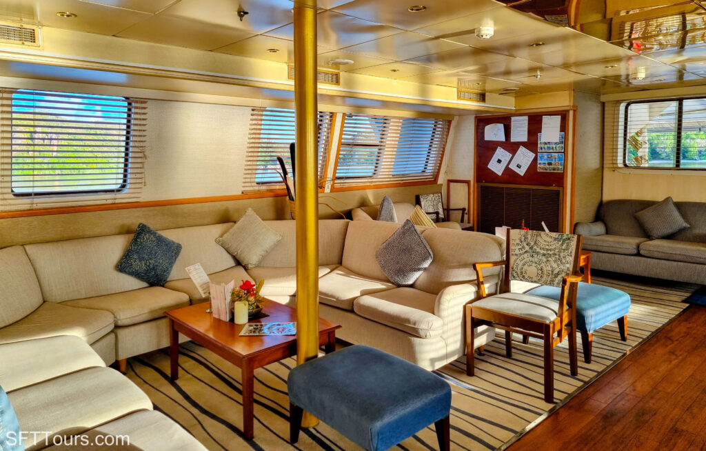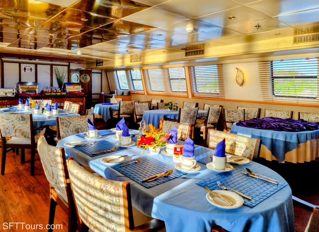 The restaurant where all meals are taken can accommodate all passengers at once in shared tables.