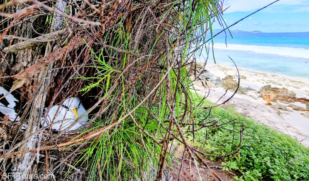 Giant tortoises usually roam around the beach area too and some boats come for the day to enjoy the powdery white sand beach and great snorkelling spot.