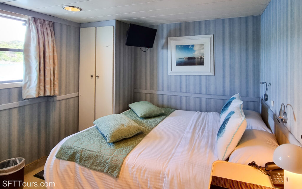 This cabin is the smallest on the ship and is located on the sun deck level at the front of the ship. It has one double bed and one window out.