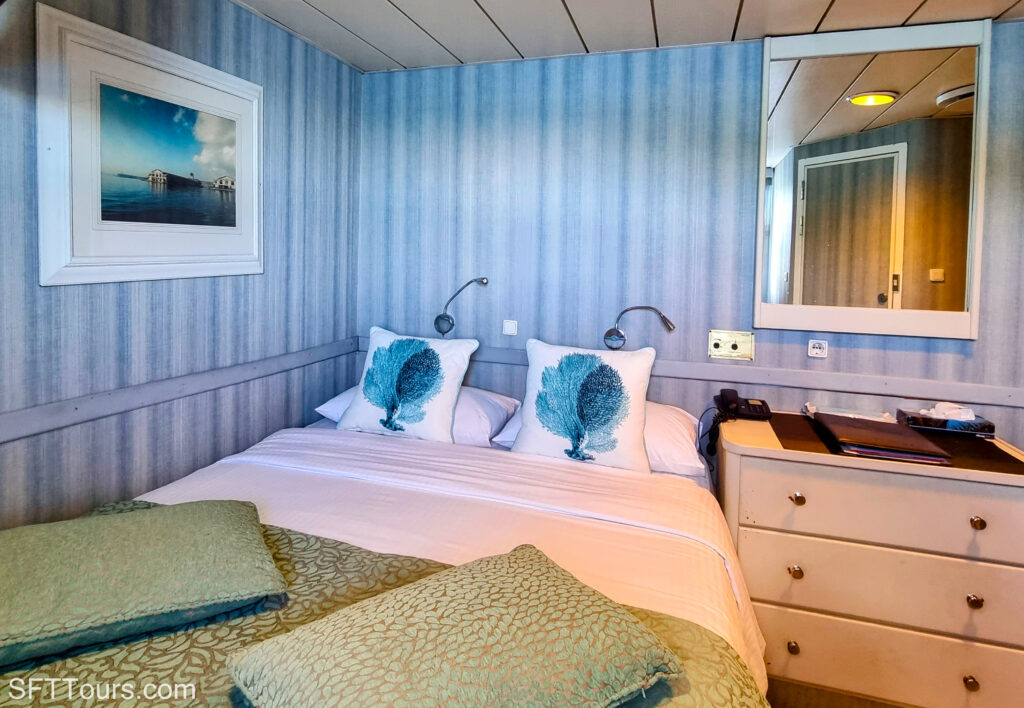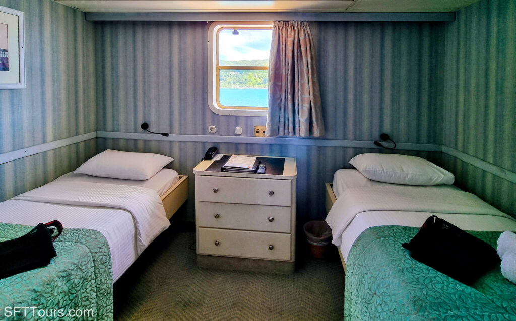This cabin is the smallest shared cabin on the ship and is located on the sun deck level at the front of the ship. It has two single beds and one window out.